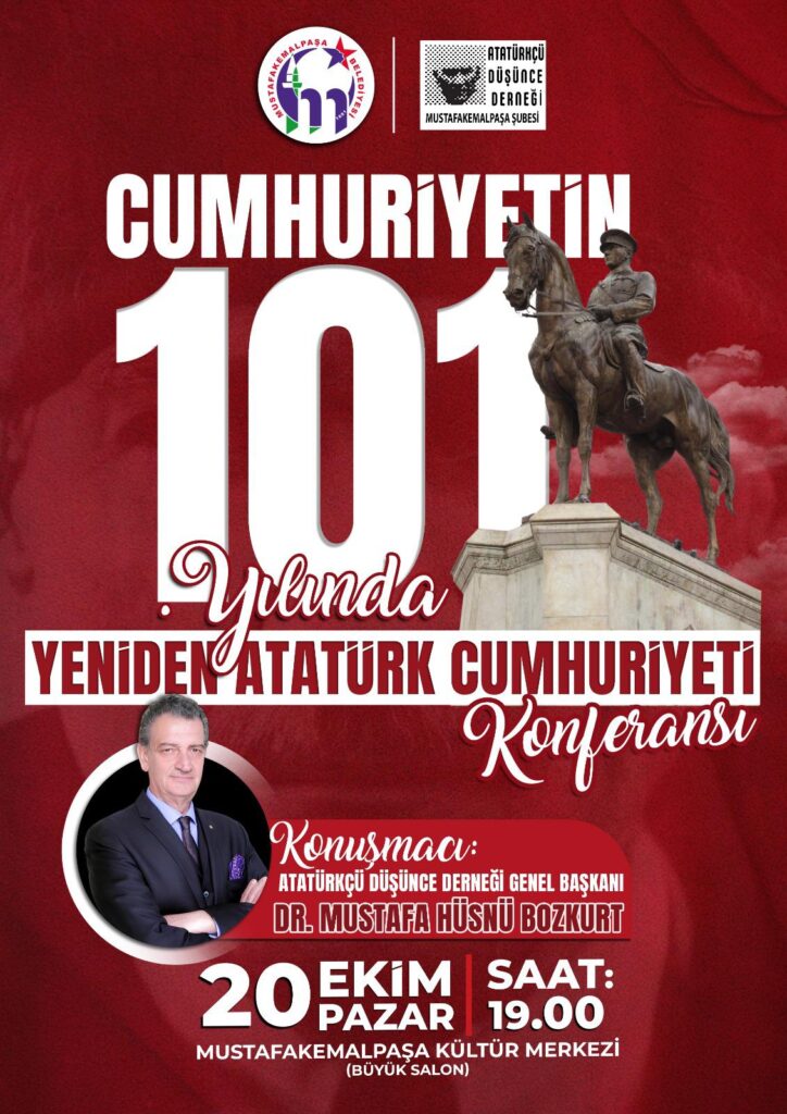 Mustafakemalpaşa Belediyesi ve Atatürkçü Düşünce Derneği Şubesi (ADD), Cumhuriyetin 101. yılında özel bir konferansa ev sahipliği yapacak. ADD Genel Başkanı Dr. Mustafa Hüsnü Bozkurt’un konuşması olarak katılacağı ‘Yeniden Atatürk Cumhuriyeti’ konulu konferans, 20 Ekim Pazar saat 19.00’da Kültür Merkezi Büyük Salon’da yapılacak.